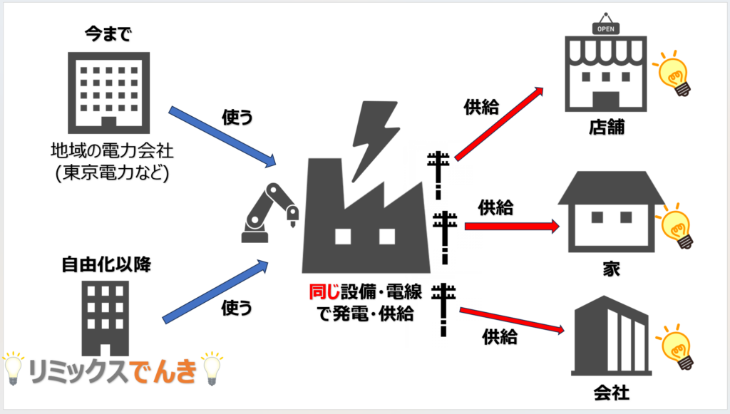 へ~、電力会社が変わっても、結局電気を作る発電設備や電気を供給する電線網は同じのを使っているんすね~。